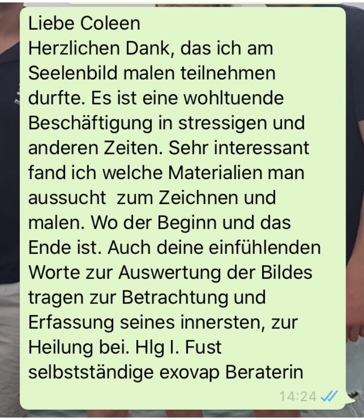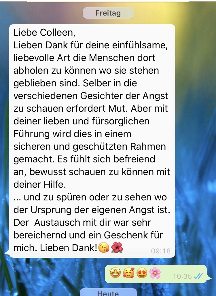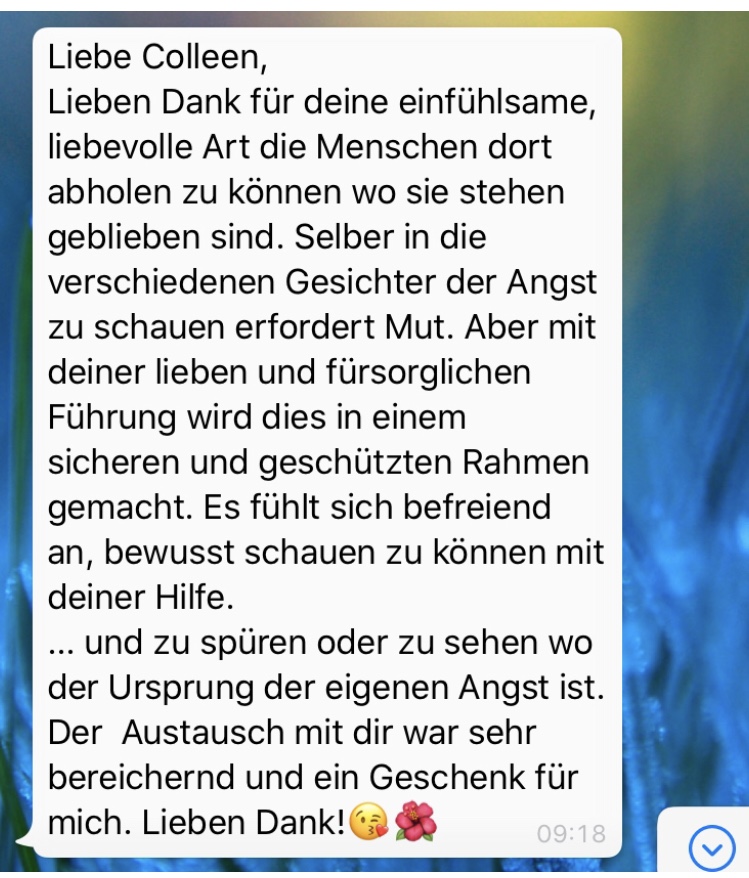 Liebe Colleen, ich danke dir herzlich für dein Angebot mit mir zu arbeiten, dass war ein Win Win Erlebnis.Ich wünsche dir weiterhin so gute Sitzungen mit vielen «Hühnerhaut- Momenten».