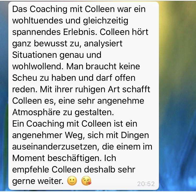 Dass wir uns letzten Sommer getroffen und kennengelernt haben war bestimmt kein Zufall, denn an Zufälle glaube ich nicht mehr Als du mir von deiner Arbeit erzählt hast wusste ich, dass wäre was für mich, und zwar zum genau richtigen Zeitpunkt, denn es war damals nicht ganz einfach für mich in meinem Leben. Ich fand unsere Sitzungen immer sehr spannen, professionell und herzlich zugleich und habe mich immer sehr wohl gefühlt bei dir. Du warst mir eine grosse Hilfe, denn jemanden zu haben der einem auch immer wieder daran erinnert am Ball zu bleiben und einem unterstützt war genau das was ich brauchte, um langfristig einen Erfolg zu erzielen. Und was für einen Erfolg! Vergleiche ich die 3 Monate vor und nach den Sitzungen bin ich echt sprachlos! Vielen lieben Dank Colleen! Ich wünsche dir viel Spass, Erfolg und alles Gute mit deiner tollen Arbeit, die du da leistest, um anderen zu helfen und hoffe, dass du noch viele weitere Menschen inspirieren kannst! Für mich war es das allemal wert.