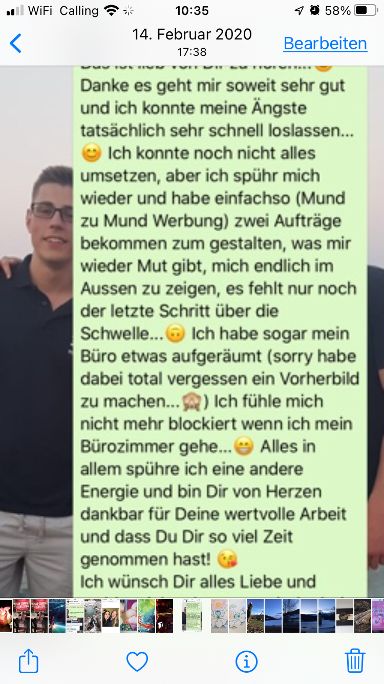 Dein unglaubliches Einfühlungsvermögen hat mir ganz viele Erkenntnisse über den Zustand meiner Tochter gebracht und mich darin bestärkt, dass ich sie endlich in Liebe loslassen darf. Sehr wichtig war für mich, dass Du als Grund für mein „nicht loslassen können“ meine eigenen Schuldgefühle genannt hast, die mich am Loslassen hindern. Dadurch weiss ich jetzt, wo ich bei ihr ansetzen kann damit wir beide frei werden und unabhängig voneinander ein schönes Leben in gegenseitiger Liebe und Respekt leben können.
